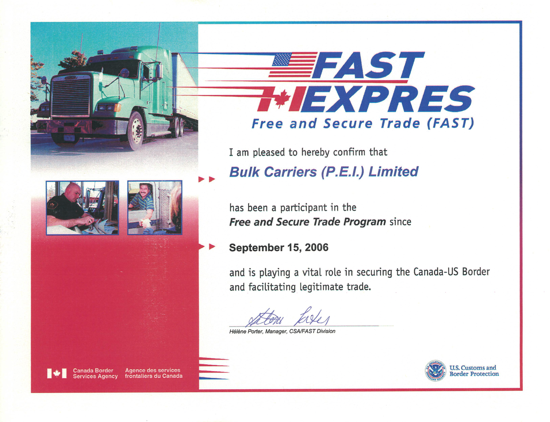 FAST is a joint program of the Canada Border Services Agency (CBSA) and U.S. Customs and Border Protection that strengthens border security while speeding cross-border shipments.